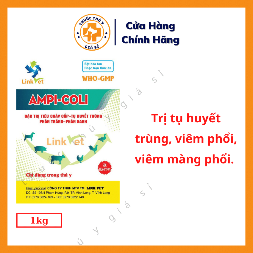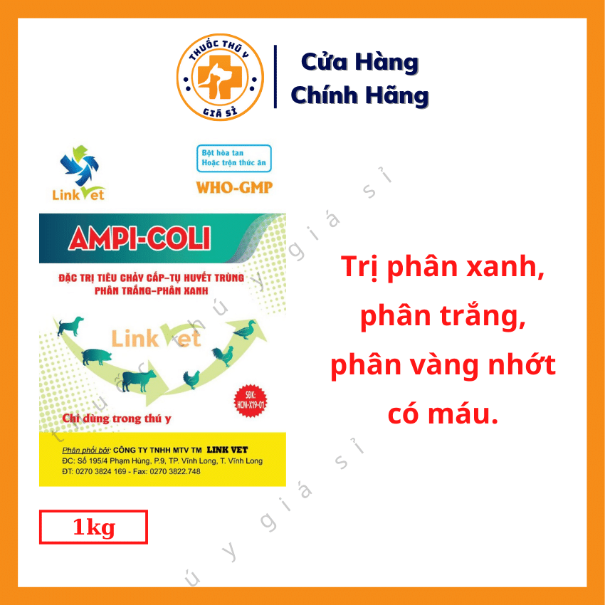 - Đặc trị các bệnh tiêu chảy phân xanh, phân trắng, phân vàng nhớt có máu, thương hàn, sốt bỏ ăn, sưng phù đầu, tụ huyết trùng, viêm phổi, viêm màng phổi gây ra bởi vi khuẩn E.coli, Salmonella, Clostridium, Haemophilus spp.